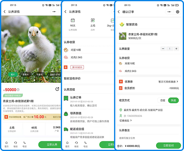 选择认养项目下单支付、农场开始进行养殖、养殖周期到达后配送给用户