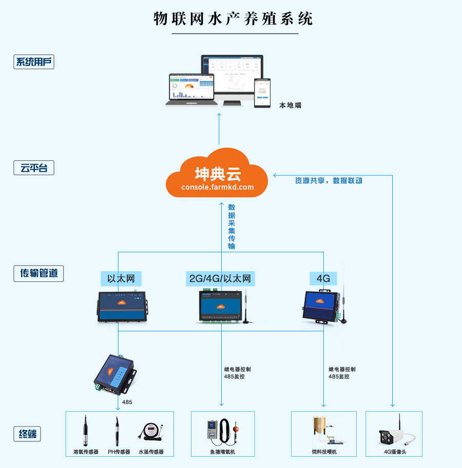 负责数据处理,设备运行状态监控,实现饲料定时定量投喂,鱼塘水质状况实时呈现,水质恶化报警推送,历史数据记录,鱼塘视频监控。