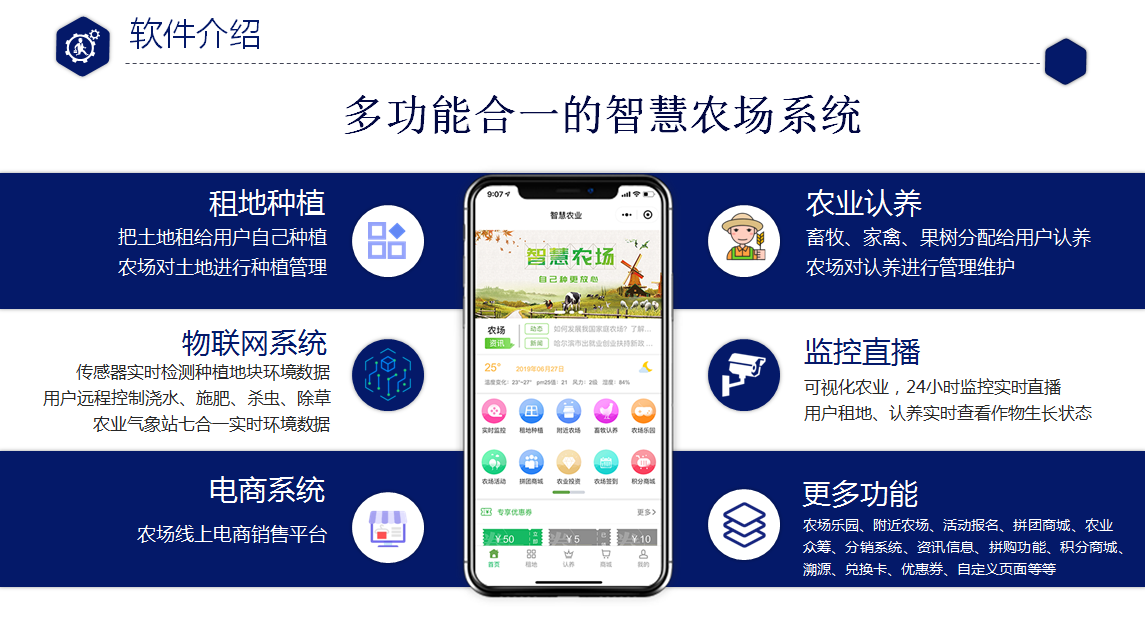 乡村振兴战略是习近平同志 2017 年 10 月 18 日在党的十九大报告中提出的战略。十九大报告指出,农业农村农民问题是关系国计民生的根本性问题,必须始终把解决好“三农”问题作为全党工作的重中之重,实施乡村振兴战略。近年来,农村电商蓬勃发展,已成为推动乡村产业兴旺的主力军和乡村振兴的新引擎。随着政策就位、市场成熟、数字技术发展和大量人才返乡,农村电商迈入“天时地利人和”的历史机遇期,迎来全面井喷的“黄金时代”。租地种植认养的软硬件设施都由彭州智农云端科技有限公司自主研发并在国家版权局有软件著作权证书。目前自主研发智慧农业相关的硬件,各种农业传感器、视频直播监控摄像头、物联网继电器,旨在通过软硬件实现集精准农业,智能农业,农业物联网,数字农业为一体的智慧农业生态。在农产品耕作上,农民可以通过对于农产品的定位、定量、定时,进行精准灌溉、施肥和杀虫等,同时,通过农机联网以及智能机器人等实现智能农业。在整个农作的生产过程中,可以将各种设备收集到的数据,进行系统化集成管理,从而实现自动化、智能 化和远程控制等,不仅如此,还可以利用传感器、摄像头、智能穿戴设备等,将农业对象、环境以及全过程进行可视化表达、数字化展现和信息化管理。同时,前端面对消费者,租地种植认养小程序已完成上线,消费者通过微信端可以直接线上农场租地种植、畜牧认养、农场商城、拼团团购、推手系统、签到积分及兑换、物联网实时监测、商品溯源、农场直播对接等智慧化操作。